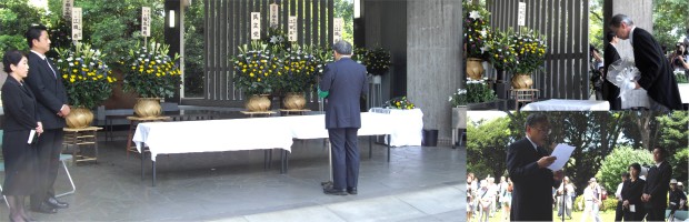 豪雨水害などが各地で頻発する異常気象のなかで、ようやく夏の暑さを感じさせる8月15日、平和フォーラムは東京・千鳥ヶ淵の国立戦没者墓苑で戦後64年の「戦争犠牲者追悼・平和を誓う集会」を行い、各団体の代表など約200人が参加しました。集会はI女性会議の大塚優子中央常任委員の司会・進行ですすめられ、12時の黙とうに続いて、江橋崇・平和フォーラム代表、那谷屋正義・民主党参議院議員、福島みずほ・社会民主党党首(参議院議員)による「誓いの言葉」が述べられたあと、各団体・参加者による献花が行われました。なお、平和フォーラムは、千鳥ヶ淵墓苑での追悼を、衆議院は解散中のため、今年は江田五月・参議院議長について要請し、議長はこれに応えて参拝しました。