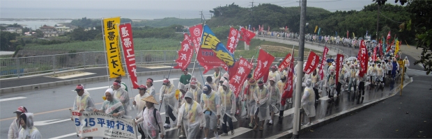 沖縄平和運動センター主催で平和フォーラムが全面的に協力する第33回5.15平和行進が5月14日朝、スタートしました。本年は、鳩山政権のもとで大きくクローズアップされた普天間基地返還と移設問題、大きな山場のなかでの行動です。東コースが移設NOのとりくみを2000日以上の座り込みをはじめつづけている辺野古、県内移設NO、超党派の9万人が参加した4月25日県民大会の開催地である読谷、24万余の命を犠牲にした沖縄戦終焉の戦跡地である摩文仁の平和記念公園の3ヵ所から、あいにくの雨天をおして計1500人が参加しました。行進は15日まで沖縄本島の東・西・南の3コースと石垣・宮古で行進が行われ、16日には普天間基地包囲の大行動を行います。