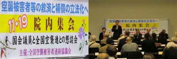 東京大空襲訴訟原告団と全国の空襲被害者やその遺族などが結集し、戦争被害は国民が等しく受忍しなければならないという論理の否定と、再び戦争の惨禍が起こることのないように、次世代の平和づくりの運動体になることを趣旨、a.軍人軍属だけでなく民間空襲被害者(被爆者も含む)を補償する「空襲等被害者援護法」の制定、b.空襲死者の調査・追悼など空襲被害者の人間回復、c.戦争の惨禍をくりかえさぬために、核兵器の廃絶など各種の平和運動との連帯を目的に、8月14日、全国空襲被害者連絡協議会(略称・全国空襲連)が発足しました。その具体的な行動として、11月19日、衆院議員会館で「国会議員と全国空襲連との懇談会~空襲被害者等の救済と補償の立法化へ11・19院内集会」を開き、100人以上が参加しました。
