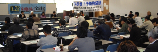 2003年7月に衆参両院での強行採決で成立され、2005年7月から施行され心神喪失者等医療観察法は、誰にも予測できない「再犯のおそれ」を理由に無期限に人を拘束し自由を奪う予防拘禁法です。制定前から内外の精神障害者当事者組織、障害者団体、日弁連や平和フーラムが、憲法、近代刑法の原則、国際人権規約などに抵触する人権侵害法として反対しました。本年、施行後5年の見直しのなか、「障がい者制度改革推進会議」の仲間、障害者権利条約締結に向けた取り組みとも連携し、差別と拘禁の法をなくすことを求める集会が、11月28日、東京・南部労政会館に約100人が参加して開かれました。主催は、心神喪失者等医療観察法(予防拘禁法)を許すな!ネットワークなどの呼びかけよる実行委員会。