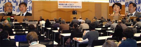 WORLD PEACE NOWや平和フォーラムなどが呼びかけた「日本製の武器が世界の子どもたちを殺すの? 新防衛大綱ってなに?12・7市民と国会議員の院内集会」が12月7日、衆院議員会館で開かれ、約110人が参加しました。国会議員としては、社民党から福島瑞穂党首(参議院議員)、服部良一衆議院議員が駆けつけました。