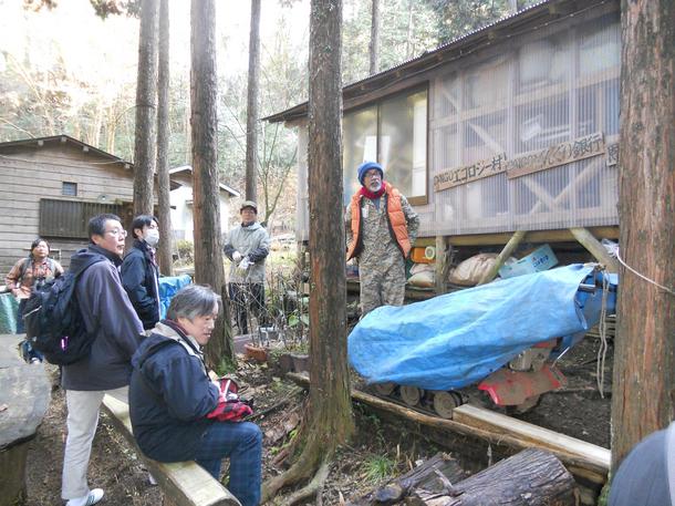エコロジー村村長の尾崎さん(元八王子議会議員)、教育長の幸地さん(元東京教組役員)から歓迎のあいさつを受けました。尾崎さんは通称「炭焼三太郎」と呼ばれていて、座学の会場となった小屋(三太郎小屋)のオーナーでもあり、またDAIGOエコロジー村のオーナーでもあります。また、幸地さんは三太郎小屋を交流施設としてスペースを利用し、退職した組合員の生涯活動の発表の場やコンサート会場として活用することを通じて、エコについて学んだり、自然と触れ合う機会を設けるなどの取り組みを地域の労働団体(自治労、全建総連首都圏建設ユニオンなど)やNPO法人日本エコクラブとの連携で展開しています(エコプロジェクト)。