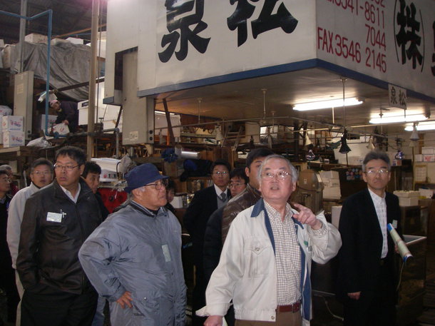 築地市場の勝鬨門から市場内の厚生会館に入った一同は、築地の仲卸「鈴与」社長・生田與克さんから、魚と漁業に関する講演を受けました。生田さんは、著書として「日本一うまい魚の食べ方」、ホームページ「魚河岸野郎」を開設するなど、各方面で活躍中の方です。べらんめい調で始まった講演は、魚河岸の人々の気質の話から、美味しい魚の食べ方、マグロ漁の辛さ、幅広い体験に基づき興味が尽きない話題が続きました。
