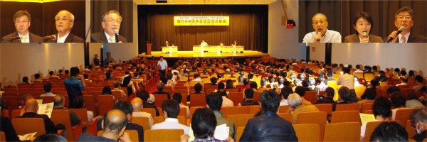 集会は、まず、「安全に生きる権利」を主題としたシンポジウム。福島第一・第二原発のある双葉郡で40年にわたり原発反対運動をつづけ、現在、故郷は避難指示地域となり、秋田市内のお姉さん宅にお孫さんと身を寄せている石丸小四郎・福島県双葉地区原発反対同盟代表、国際環境NGO FoE(地球の友) Japanで森林問題、国際金融と開発問題にとりくみ3.11以降は、脱原発・持続可能なエネルギー政策の実現に向けた各種活動に従事している満田夏花さん、消費者の立場から、食の安全・監視市民委員会事務局長や、脱グローバリゼーションの運動「脱WTO/FTA草に根キャンペーン」やTPP問題のとりくみの中心を担っている山浦康明・日本消費者連盟事務局長の3人のパネリストとコーディネータ役の江橋崇平和フォーラム代表(法政大学教授)が討論しました。江橋代表の主催者あいさつを兼ねた提起を受けて、それぞれ問題提起。石丸さんは「広島、長崎への原爆投下をはじめ、日本ほど放射能の怖さを体験した国はない。自然エネルギーへの転換を本気で考えるべき」と訴え、山浦さんは食品の放射線汚染を巡る情報開示が不十分だとして「政府や自治体に自分たちで正確な情報を開示させることが必要。生存権が脅かされてはならない」と呼びかけました。
