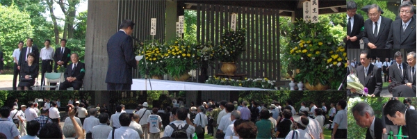 8月15日、猛暑のなか平和フォーラムは東京・千鳥ヶ淵の国立戦没者墓苑で戦後66年の「戦争犠牲者追悼・平和を誓う集会」を行い、各団体の代表など約200人が参加しました。平和フォーラムは、政権交代後の昨年来、千鳥ヶ淵墓苑での追悼を、衆議院議長や全閣僚に要請しましたが、これに応えて、集会に先立ち、横路孝弘・衆議院議長が参拝しました。この他、菅直人首相や江田五月法相・環境相、枝野幸男官房長官も参拝・追悼しました。集会は、I女性会議の中村ひろ子中央常任委員の司会・進行ですすめられ、12時の黙とうに続いて、江橋崇・平和フォーラム代表、斎藤勁・民主党衆議院議員、福島みずほ・社会民主党党首(参議院議員)による「誓いの言葉」が述べられたあと、各団体・参加者による献花が行われました。