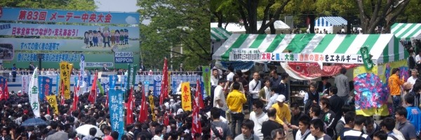 4月28日、東京・代々木公園で第83回メーデーが開催されました。約3万5000人(主催者発表)が参加した集会に、平和フォーラム・原水禁は「太陽と風、大地、自然の恵みをエネルギーに」をテーマにブースを出し、パネル展示とさようなら原発1000万人アクション物資の販売を行いました。