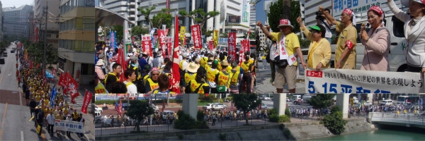 5月11日朝、第35回5.15平和行進は、東コースが名護市辺野古から、西コースが読谷村役場前から、南コースが那覇市の沖縄県庁前広場から出発しました。東西コースは嘉手納基地など米軍基地、南コースは南部戦跡地などを行進し、13日には普天間基地のある宜野湾市の海浜公園野外劇場の県民大会に集結します。南部コースでは、出発式で崎山嗣幸議長があいさつ。社民党の狩俣信子副委員長(県議会議員)、沖縄社大党の糸数慶子委員長(参議院議員)のあいさつ、当該地の県職労、那覇市職労のあいさつなどを受けて出発しました。