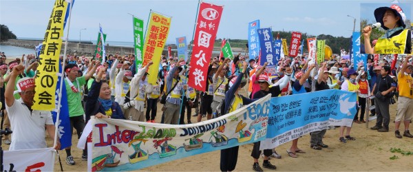 第37回5.15平和行進が5月16日朝、東、西、南各コースの平和行進団が一同に会し、辺野古の浜(名護市)で出発集会を行いました。昨日までの梅雨空から一転して沖縄の太陽が照りつけるなか、1200名が参加。集会あいさつに立った藤本泰成平和フォーラム事務局長、安次冨浩さん(ヘリ基地反対協代表)らが「軍隊が世界に出るのは侵略でしかない」「豊かな辺野古の海を守ろう」などと訴え、安倍政権が押し進める集団的自衛権の行使で戦争ができる国づくりと、沖縄の民意を無視した辺野古新基地建設を批判しました。また韓国から参加した「戦争反対平和実現国民行動」の仲間たちは、人目を引くカラフルな横断幕を掲げ、ソン・ミハさんが「在韓米軍、在日米軍そしてアジアの全ての米軍を撤退するまで闘おう」と力強くアピールしました。