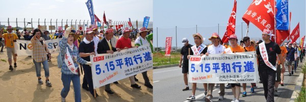 平和行進は辺野古での集会の後、東コースが宜野座からキャンプ・ハンセンへ、西コースが読谷村から嘉手納基地へ、南コースが南部戦跡を行進。17日には基地や沖縄戦の足跡をたどります。そして18日には世界一危険な普天間基地を包囲する行動を取り組み、宜野湾海浜公園で県民大会が行われます。