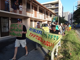 首脳会合が行われた12日には、集会参加者や地元の活動者、学生など1000人がホノルル市内をデモ行進し、「自由貿易、グローバリゼーションは格差を拡大する」「APEC・TPPは農民・市民の敵だ」などと、横断幕・プラカードを手にシュプレヒコールをあげました。(写真右はデモ行進する日本からの参加者)