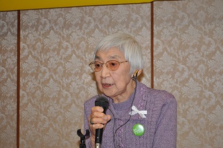 続いて、「戦争をくり返さないために」と題し、平和の白いリボン実行委員会の浮田久子さんが、自らの戦争体験を踏まえ、「戦争末期には勝つとは思っていなかった。しかし、死しか残されていなかった」など悲惨な体験を語り、「いま生きている私たちは、二度とこうしたことを起こさせない責任がある。少しでもいい世界を残すために、がんばりましょう」と呼び掛けました(写真上左)。