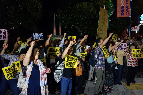 集会後、参加者は総理官邸前に移動し、「解釈改憲は許さないぞ!」「閣議決定絶対反対!」などとシュプレヒコールをあげました。国会議員も多数駆けつけ、安倍政権の暴走を止めるために国会でも追及する事を表明。さらに韓国の平和団体の代表も参加し、「従軍慰安婦」問題での安倍政権の姿勢を強く批判し、「集団的自衛権が行使されたら、朝鮮半島が戦場になる。韓国でも反対の声が高まっている」と訴えました(写真上左)。
