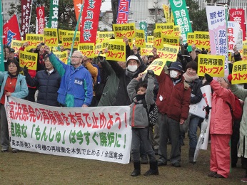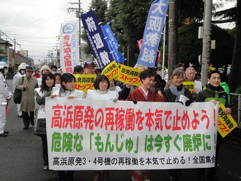 集会終了後参加者は、隣接する公園で開かれた「高浜原発3・4号機の再稼働を本気で止める!全国集会」に合流し、福井駅までデモ行進をし、もんじゅの廃炉と再稼働反対を沿道の市民に訴えました。