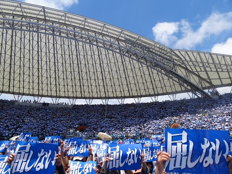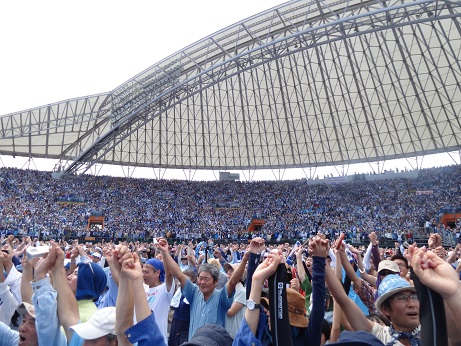「沖縄県民は決して屈せず、新基地建設を断念させるまでたたかうことを宣言する」。米軍普天間飛行場の名護市辺野古への移設に反対する「戦後70年 止めよう辺野古新基地建設!沖縄県民大会~建白書の理念を実現させよう~」が、5月17日、那覇市の沖縄セルラースタジアムで開かれ、沖縄県民をはじめ、平和行進に参加した全国の代表者など3万5千人が参加。辺野古の海や大浦湾をイメージした大会シンボルカラーの「青」を身につけ、会場を青く染め上げました。大会は超党派の実行委員会が主催し、翁長雄志県知事も参加し、「辺野古に新基地は作らせない。普天間基地は閉鎖・撤去こそが『唯一の解決策』だ」と確認しました。(写真はメッセージボードを掲げる参加者)