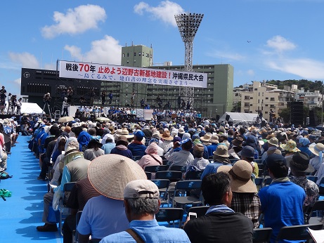 沖縄人の血を引く、作家の佐藤優さん(元外務省主任分析官)は「自分は日本系沖縄人になってきた。官僚は腹黒いが、沖縄は過去も現在も未来も沖縄人のものだ」と強調。若い世代を代表し、沖縄国際大4年の古堅智美さんは「毎日、オスプレイの爆音と恐怖の中で大学に通っているが、辺野古移設は解決にならない」ときっぱりと述べました。