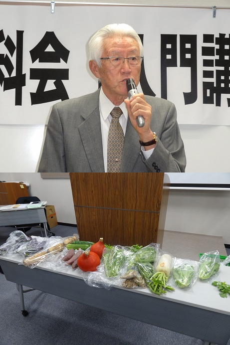 講演では、実物の加賀野菜が展示され、参加者は加賀野菜の持つ独特の色・形やその瑞々しさを手に取って体感しながら、加賀れんこんや金沢春菊、金時草をはじめとする加賀野菜の歴史や特徴、効能などについて、大藏さんの解説に耳を傾けました(下写真)。