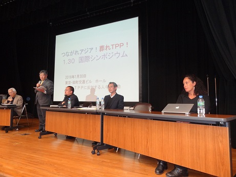 TPP交渉は昨年10月5日に大筋合意が発表され、2月4日に12ヵ国政府による署名式がニュージーランド(NZ)で行われます。これを前に、TPP阻止の国際的なつながりを深めようと、平和フォーラムも協力する「TPPに反対する人々の運動」は、NZ、マレーシア、韓国から活動家を招いて、1月30日に東京・「田町交通ビル」ホールで、「つながれアジア!葬れTPP!国際シンポジウム」を開催し、約100人が参加しました。