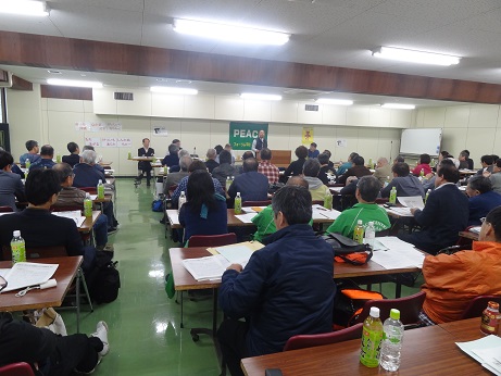 再び、那覇市に戻り、全国活動者会議を開き、福山真劫代表のあいさつ(別掲)、山城博治・沖縄平和運動センター議長の決意表明などを受けた後、「2016年度運動方針案」を藤本泰成事務局長が提起し、沖縄基地問題や各地の基地問題、原発や1000人委員会運動など、各地の活動報告や質疑討論をおこないました(下写真)。