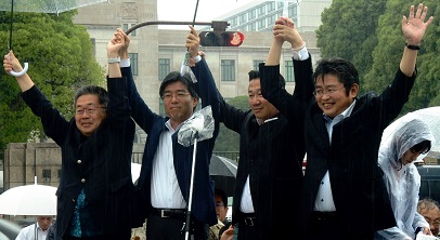 各政党を代表して、立憲民主党の福山哲郎幹事長、社会民主党の吉川元衆議院議員、共産党の小池晃書記局長、無所属の会の田嶋要衆議院議員が登壇。口々に、野党の力をあわせて、安倍政権の退陣に向け、共にたたかう決意を述べました。(下写真は野党各党代表)