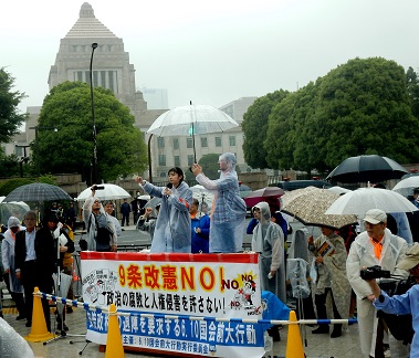 6月10日、「戦争させない・9条壊すな!総がかり行動実行委員会」を中心に、23の団体で構成された「6・10国会前大行動実行委員会」が主催して、「安倍9条改憲NO!政治の腐敗と人権侵害を許さない 安倍政権の退陣を要求する6・10国会前大行動」が、激しい雨の中、国会正門前で開催され、2万7000人が参加しました。「安倍政権をみんなで倒そう!」「森友・加計疑惑徹底追及!」「改憲発議みんなで止めよう」「あきらめないぞ!」などのコールが国会前に響き渡りました。