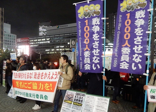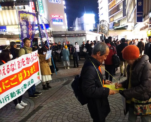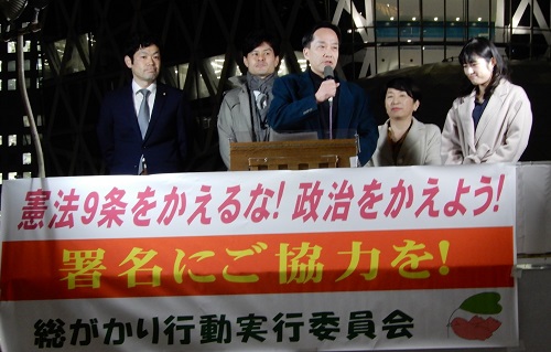 総がかり行動実行委員会は1月29日、18時半から、東京・新宿駅西口で、「STOP!安倍改憲発議、緊急署名街頭宣伝」行動を実施、新たにスタートした改憲発議に反対する全国緊急署名への協力を訴えました。