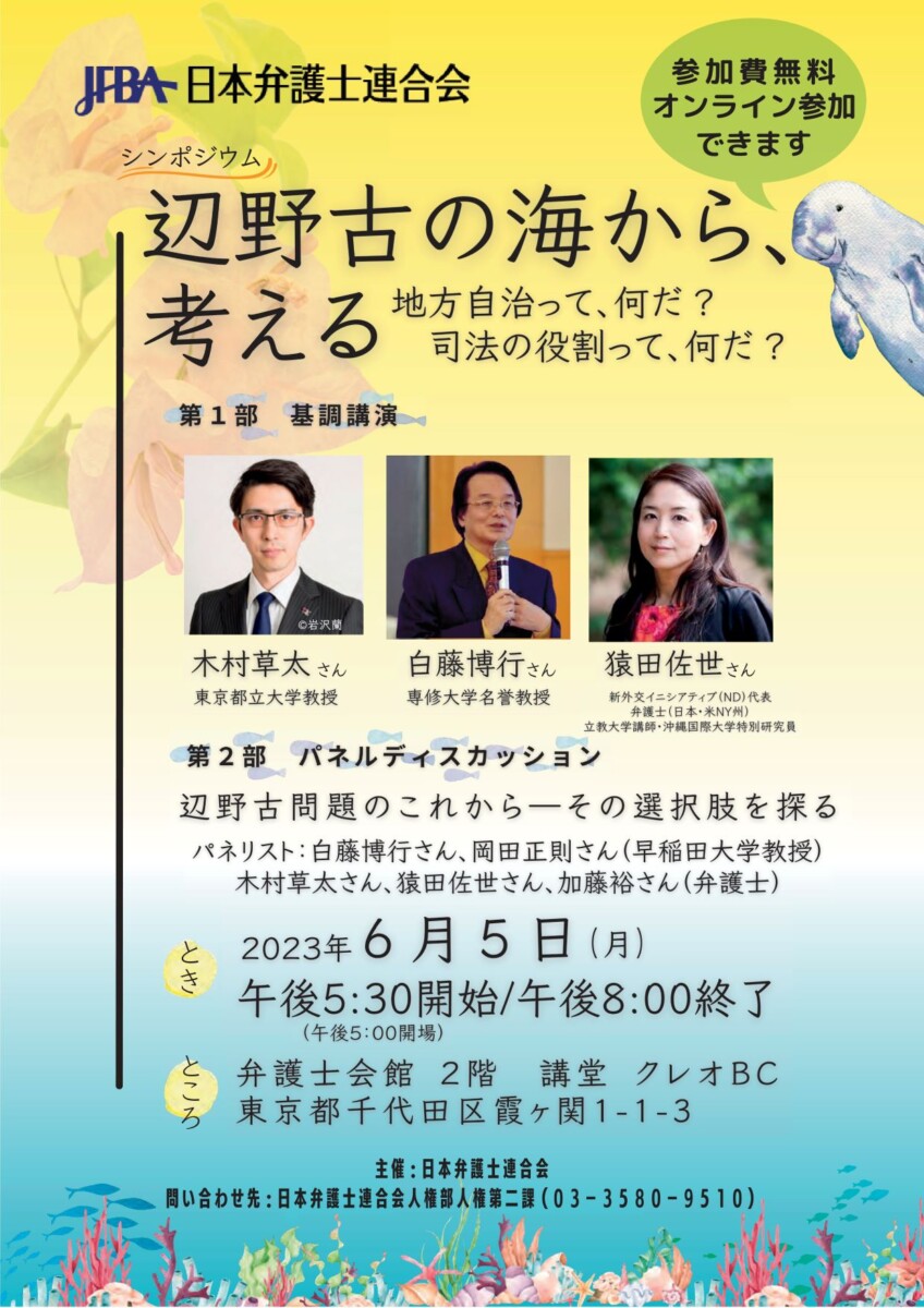 この問題について日本弁護士連合会が6月5日、シンポジウム「辺野古の海から考える、地方自治って何だ? 司法の役割って何だ?」を開催しますので、ご紹介します。