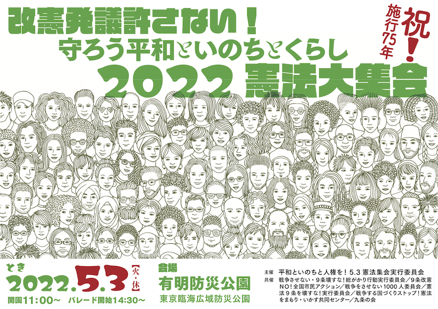 今年(2022年)5月3日の憲法記念日は、3年ぶりとなる東京・有明防災公園での集会実施に向け、準備しています。