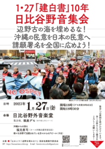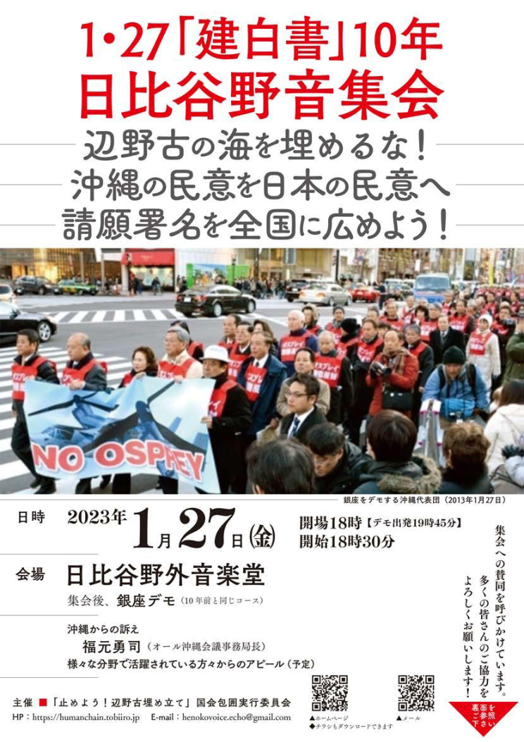 2013年1月27日は、沖縄県の市町村長・市町村議長が、「オスプレイの配備撤回・普天間飛行場の閉鎖・撤去と県内移設断念」を求める「建白書」を携え、日比谷野外音楽堂で集会、銀座でデモ行進をした歴史的な日であり、2023年1月27日はこの日からちょうど10年になります。