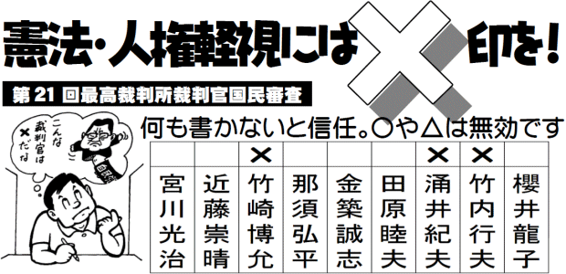私たちは、日米ガイドライン見直し時の外務省条約局長で小泉政権下の外務事務次官としてアメリカのイラク戦争支持・自衛隊イラク派兵をすすめた竹内行夫裁判官、住基ネット違憲の大阪高裁判決を破棄したほか労働裁判で多くの反動的判決をしてきた涌井紀夫裁判官、問題の多い裁判員制度導入の責任者であり判事任命と同時に、最高裁長官に「異例」の就任をした竹崎博允長官の3人を中心に「×」をつけることをよびかけます。
