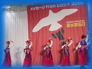 | オープニングの前に、急きょ、「核廃絶の壁」キャンペーン−木製ブロックに平和のメッセージを書いて壁を作る運動を世界で展開しているドイツの高校生が参加。壁の取り組みとメッセージを紹介してくれました。つづいて、広島朝鮮初中高級学校、高級部舞踏部の皆さんによる民族舞踊「巫女の舞」のオープニングが始まりました。独特でありながら、どこか懐かしさを感じさせる民族音楽と華麗な踊りに、子どもたちは真剣に見入っていました。 |