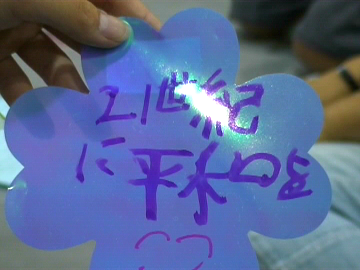 第2セクションは、平和へのメッセージを作る時間です。それぞれが、キラキラした花型のフィルムに想いを書き込んでいきました。その中には、何を書こうか迷っている子もいれば、2枚、3枚と意欲的に書き込んでいる子もいました。