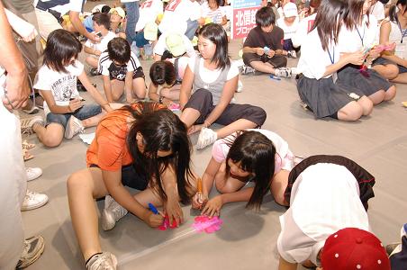 ここで、「メッセージfromヒロシマ2008」の大切な目的の一つである、平和のメッセージを発信する時間です。実行委員、そして、平和を願う気持ちを持って集まった子どもたちの代表として、石田さおりさんと、森崎和仁さんがメッセージを読み上げてくれました。会場からは拍手が沸きあがり、メッセージは、みんなの気持ちを乗せてメールとして、核保有国に同時送信されました。その後、先の時間で書き込んだ平和へのメッセージが、大きな鳩の形となって現れました。キラキラと光る花形シートのきれいさと迫力に圧倒されました。そこで、司会者からの「最後に思いっきり踊りましょう」という声がかかりました。子どもたちも実行委員も、全員が笑顔で思い切り踊りきりました。 |