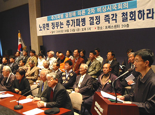 午後1時から1時間30分程行なったこの 日の会議を通し、イラク派兵反対非常国民行動は、政府の派兵決定以後の行動計画と、派兵反対のための汎国民行動指針を決定して、非常時局決議文を