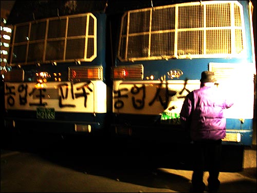 一部農民らは、警察バスと近隣道路工事場の壁、アスファルトの上等に「FTA反米闘争」「民族農業万歳」「開かれた我等の党の解体」などの文句をペイントスプレーで書いた。