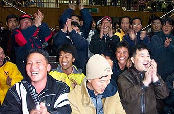 | △15日0時に、扶安郡住民投票結果が 反対の圧倒的な優勢が判明されると、 全羅北道扶安郡扶安邑東小学校講堂に 設けられた開票場に集まった扶安住民たちが拍手して歓呼している。 |
