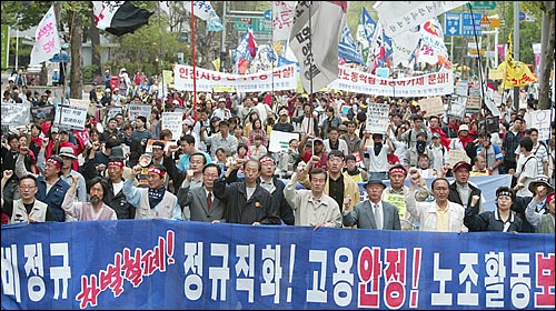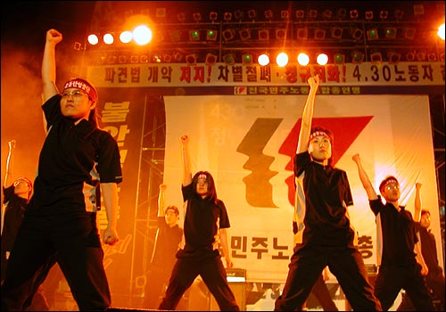 特に、メーデー本行史が開かれる前、「最低賃金実践団」も演説をし、非正規職差別撤廃と最低賃金制改善を主張し、民主労働党と正規職労働者の賛同を訴えた。
