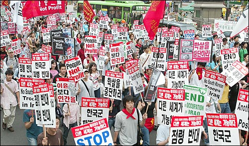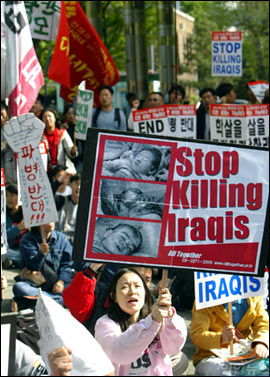 共同行動は「韓国政府はそれでもイラクの『平和と再建』を名分に重火器で 武装した特戦司令部、海兵隊を送ろうという計画を推進している」としながら、「われらは今日114周年メーデーに、ジョージ・ブッシュは既に敗北し、