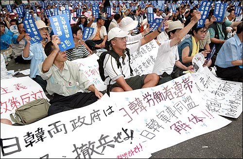 この日の大会には、日本から労組関係者と市民運動家らが参加し、注目を浴びた。日本の参加者は、「日・韓労働者連帯で米・日・韓軍事同盟解体」、「日・韓2政府はイラク派兵を撤回しなさい」、「天皇制の戦争責任糾弾」、「靖国神社解体」、「新自由主義教育政策反対」などが書かれた大きい紙を掲げた。