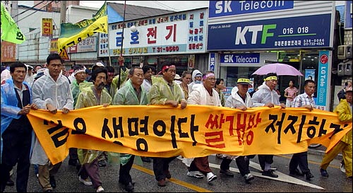 イキョンへ追悼1周期、井邑(ジョンウプ)でコメ開放反対農民の激烈デモ