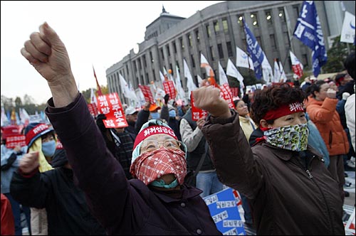 午後3時30分、光化門に集まった5万余 名の労働者大会参加者らは、「非正規職改悪法撤廃! 韓日・韓米FTA反対! 国家保安法廃止! 労働基本法争奪!