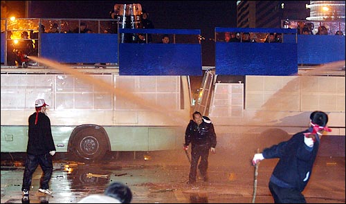 警察は水大砲を射って大会参加者等の 光化門進出を防いで、集会参加者らは これに対抗し、竹、焼酎瓶、工事現場 施設物などを投げて強力に抗議した。