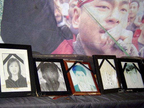 テントの入口には、彼らの闘争が1年を超えたことを知らせる「370日」という数字とともに「Stop Crack Down(取り締まり中断)」、「We are labor(われわれは労働者)」、「We are One(われわれはひとつ)」、「Let's fight together(共に戦おう)」という文句が書かれ、その近くに作られたテーブルの上には、これまでに死んでいった移住労働者たちの色あせた遺影が置かれていた。