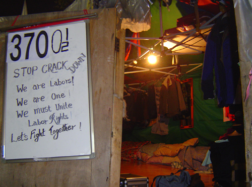 “Stop Crack Down、We are labor!”(取り締まり中断、われわれは労働者だ)