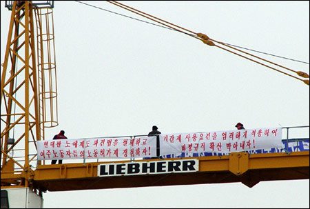 彼らは地上50m高さのタワークレーンに「現代版奴隷制度派遣法を撤廃して、 移住労働者等の労働許可制を勝ち取ろう」、「期間制使用要件を厳格に制限して、非正規職拡散を防ごう」と書かれた大型懸垂幕を掛けて、