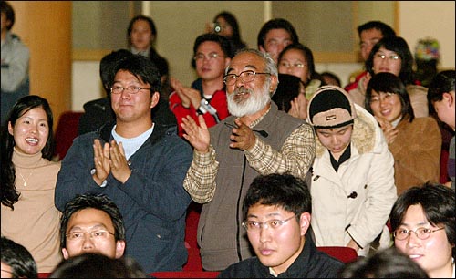 | ▲「ブッシュ・ブレア・盧武鉉のイラク戦争犯罪と派兵に対する民衆法廷」で 李トクウ首席判事が被告人らに対して有罪を宣告すると傍聴席にいた参観人らが起立拍手を送っている。 | |