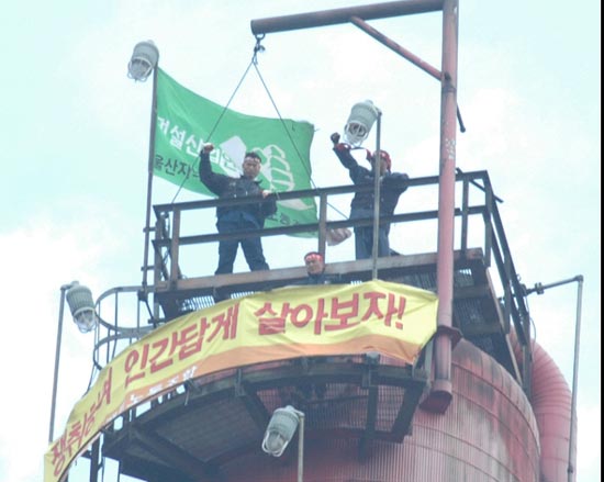 1日午前6時50分頃、蔚山建設プラント労組所属の3名の組合員がSK蔚山FCC工場内の精油塔を占拠して、70M上空で 高空座り込みに突入した。