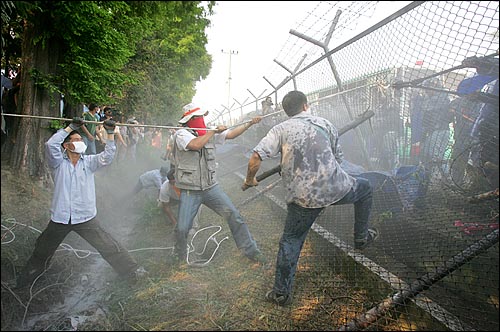 鉄條網が取られ始めると、空軍基地の中にいた警察は、接近鉄條網を壊すデモ隊に向かい、消防車を動員し、水をかけたり、消化粉末粉を発射し対応した。