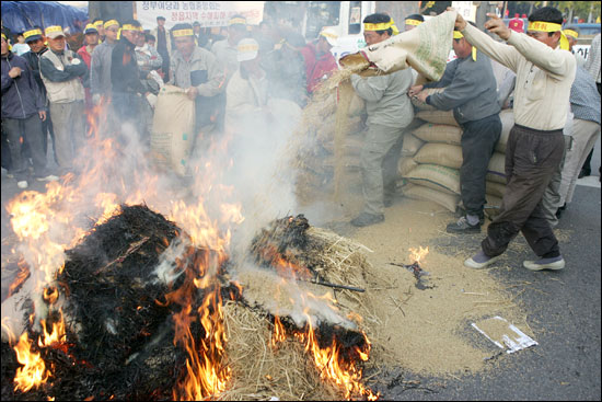 | 全北井邑(ジョンウプ)農民らがコメ交渉国会批准反対、 コメ値段保障、水害被害補償を促す井邑農民大会を開いて、息子のようなコメを燃やした。 | |