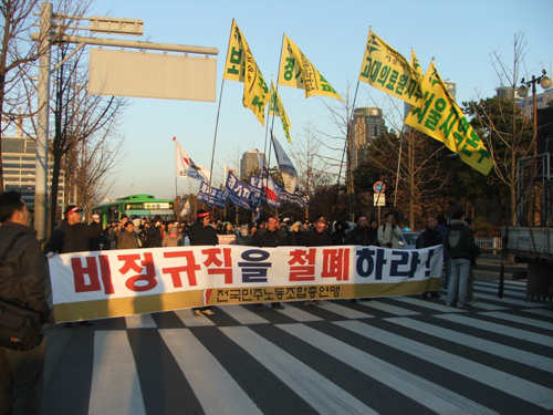 ジョンゼィファン・民主労総非常対策委員長は大会辞を通し、「私達が強調していることは政府の非正規法案が通過されると、全体労働者らが焦土化され、崖に落ちるはずだ」と説明し、「われらは期間制も、派遣制も容認出来ない。前民衆の団結闘争で必ず非正規権利保障立法を勝ち取ろう」と主張した。