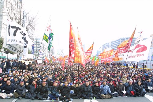 民主労総ゼネスト、二日目を向かう3月1日、汝矣島国会前に1千余名の民主労総組合員らが集まり、新たに決意を固めた。